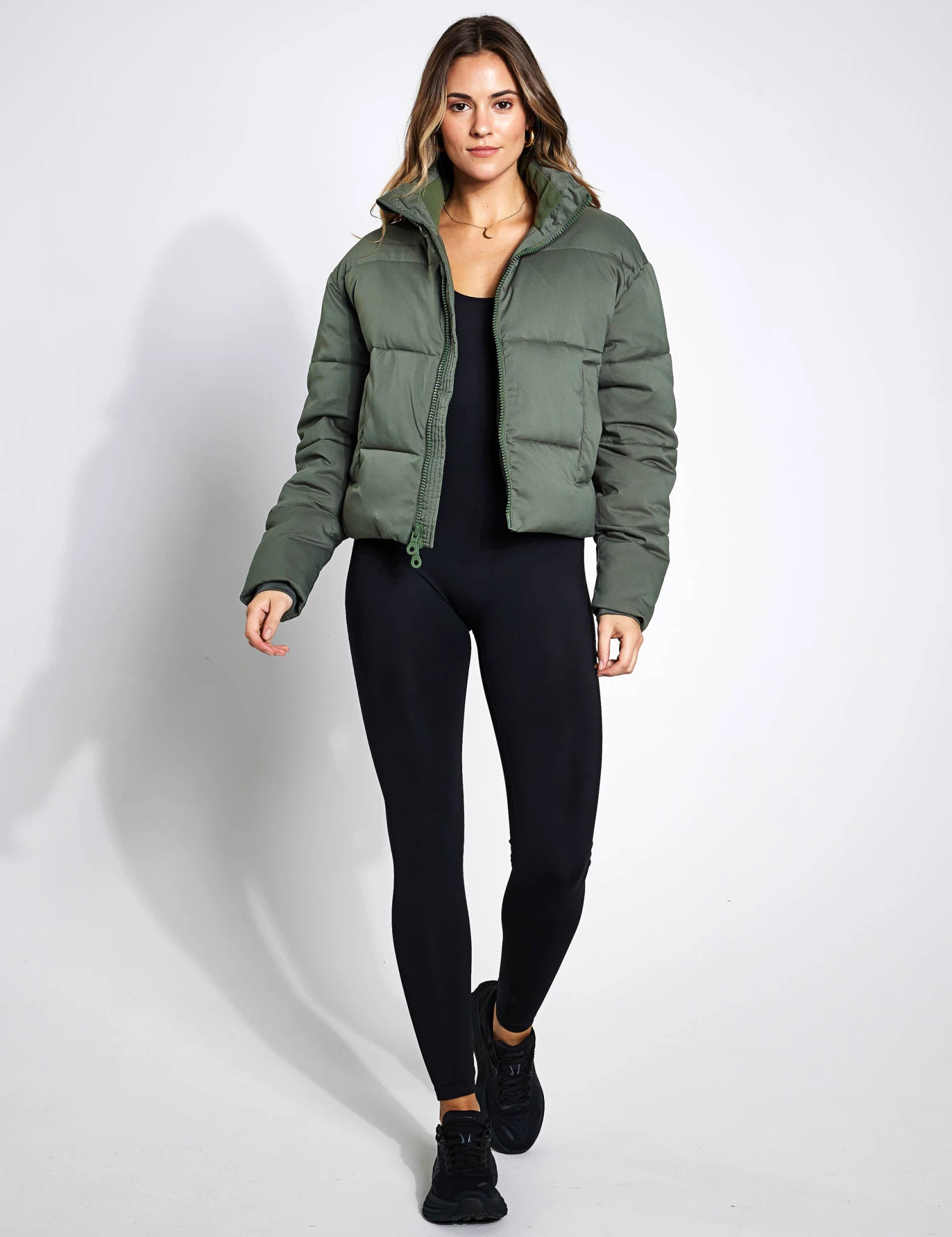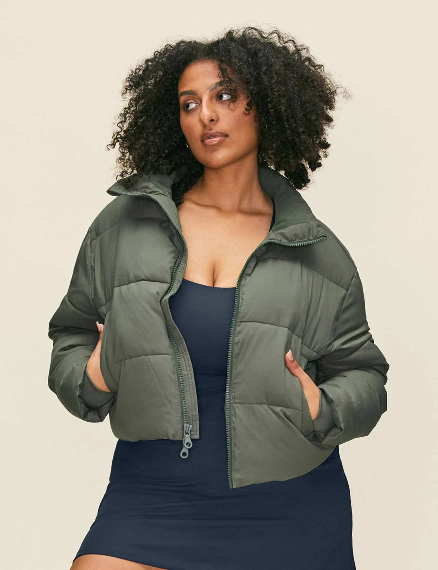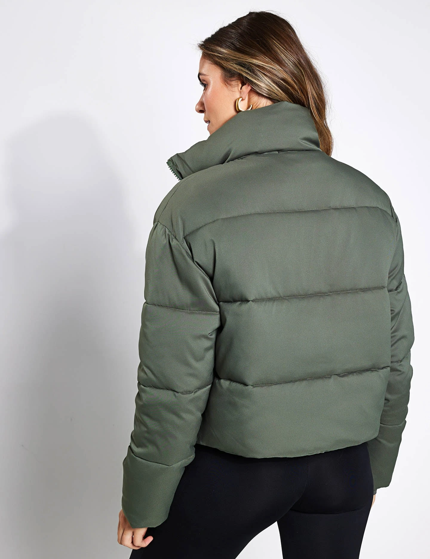 Just like a warm hug. Girlfriend Collective’s Cropped Puffer jacket in Thyme keeps you cosy, dry and warm on the wettest of days. Throw yours on and stay protected between studio sessions.
