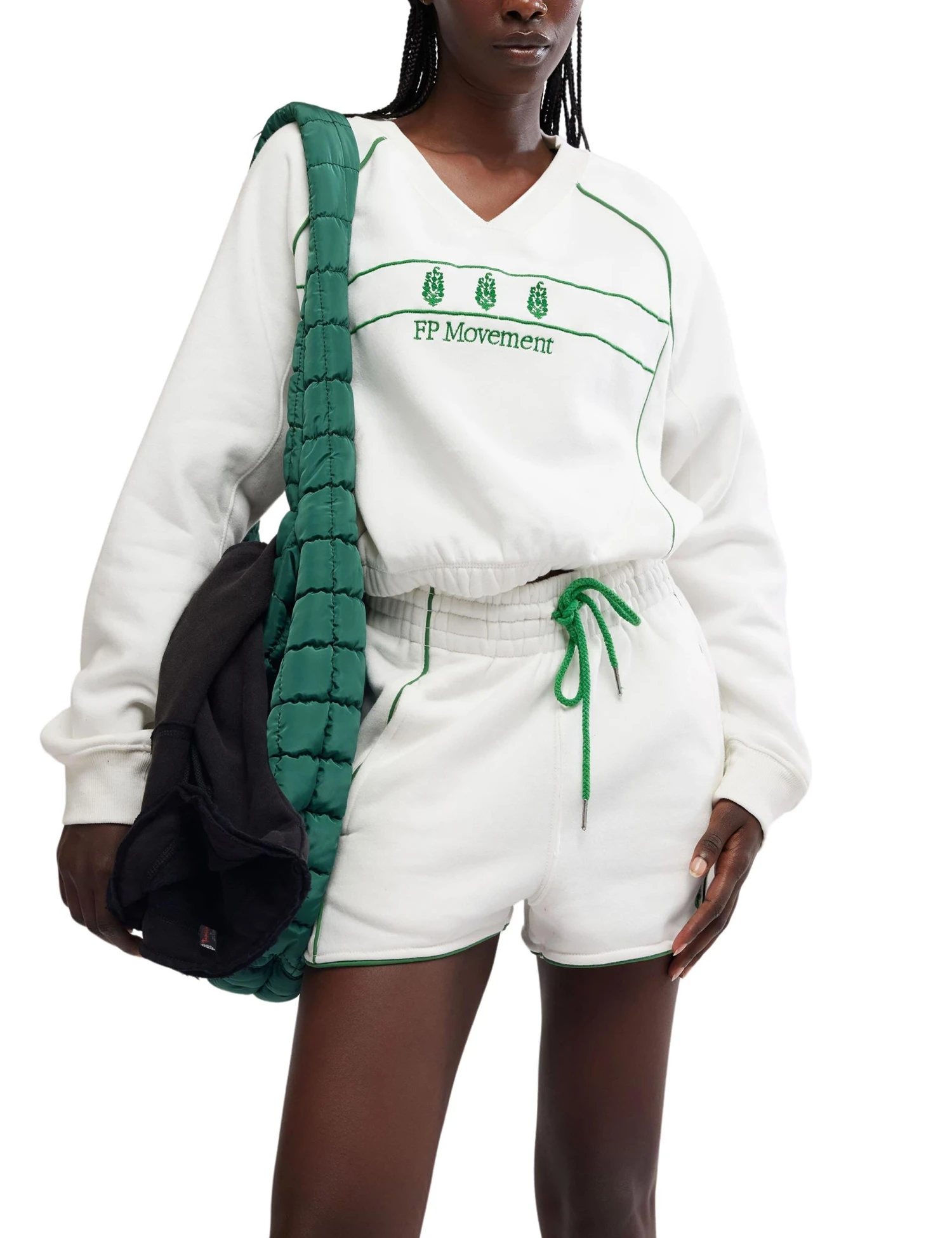 Get double the fun with the Seeing Double Set, featuring a pullover top with a V-neck, balloon sleeves, and an elasticated hem, paired with high-waisted, shorty-length bottoms with a drawcord waist and side seam pockets.