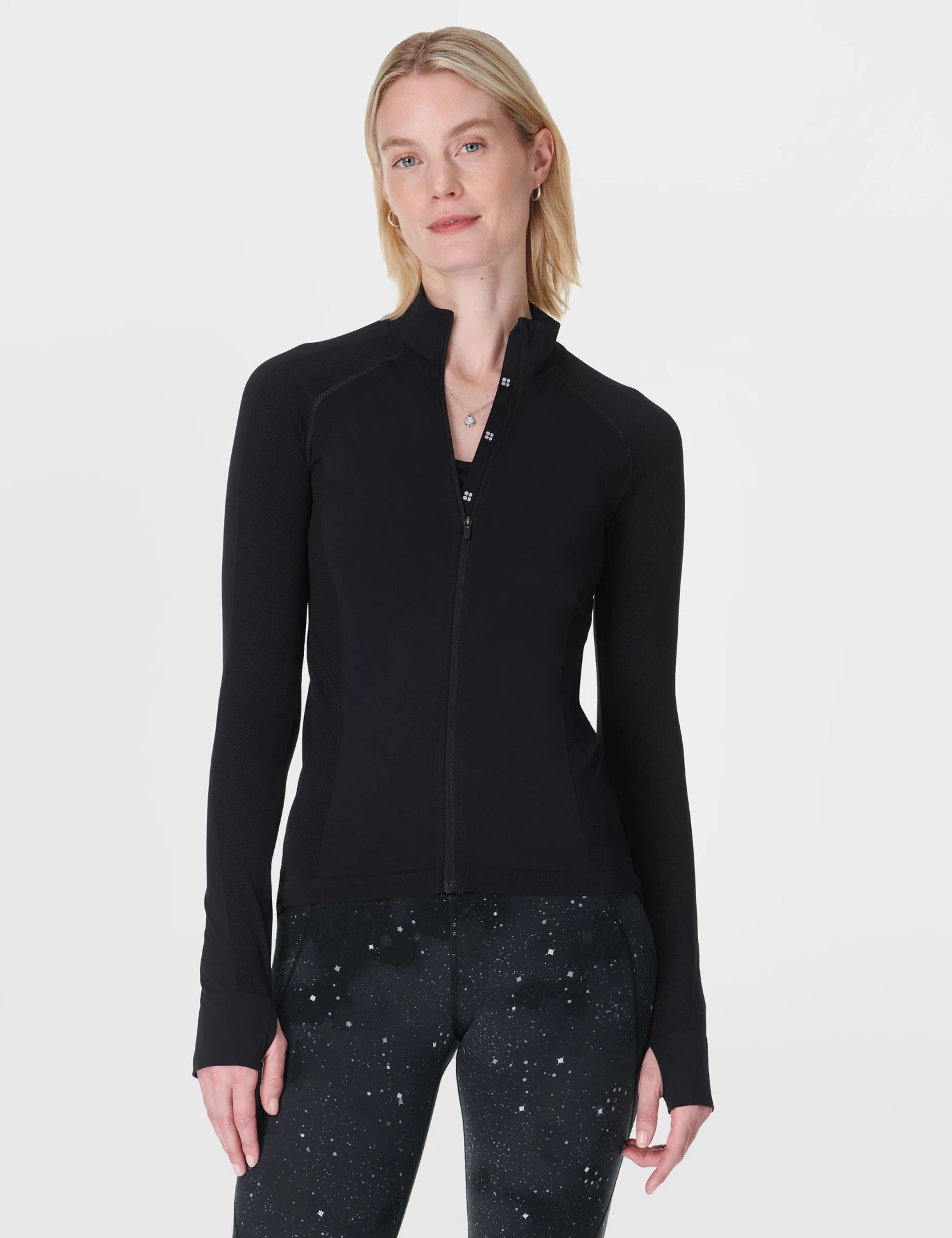 The full-length Athlete Seamless Workout Zip Up is the ultimate layering piece for every workout. Featuring lightweight, sweat-wicking fabric, thumbholes for added warmth, and a high-stretch fit, it offers both style and performance. Perfect for warming up, cooling down, or wearing on the go.