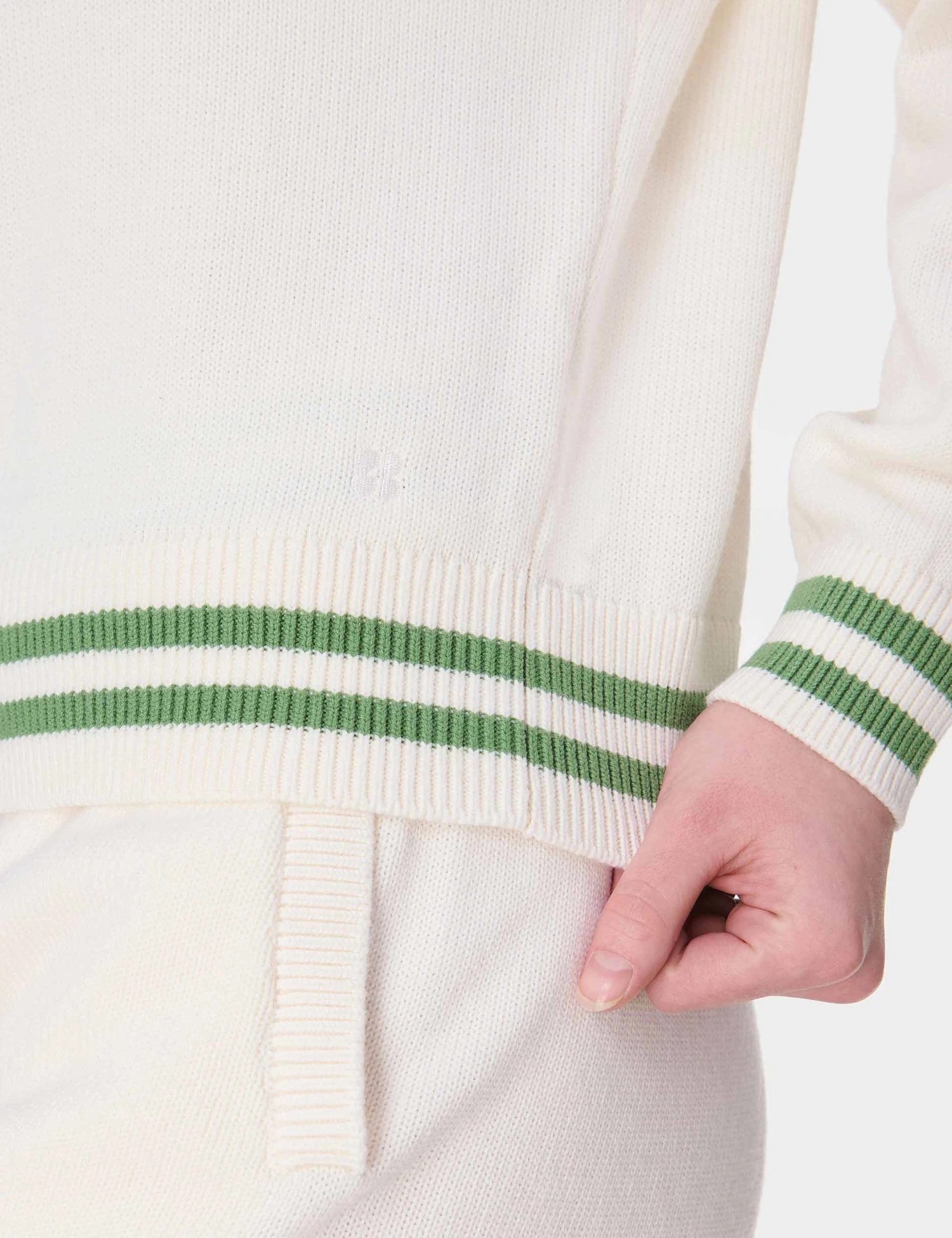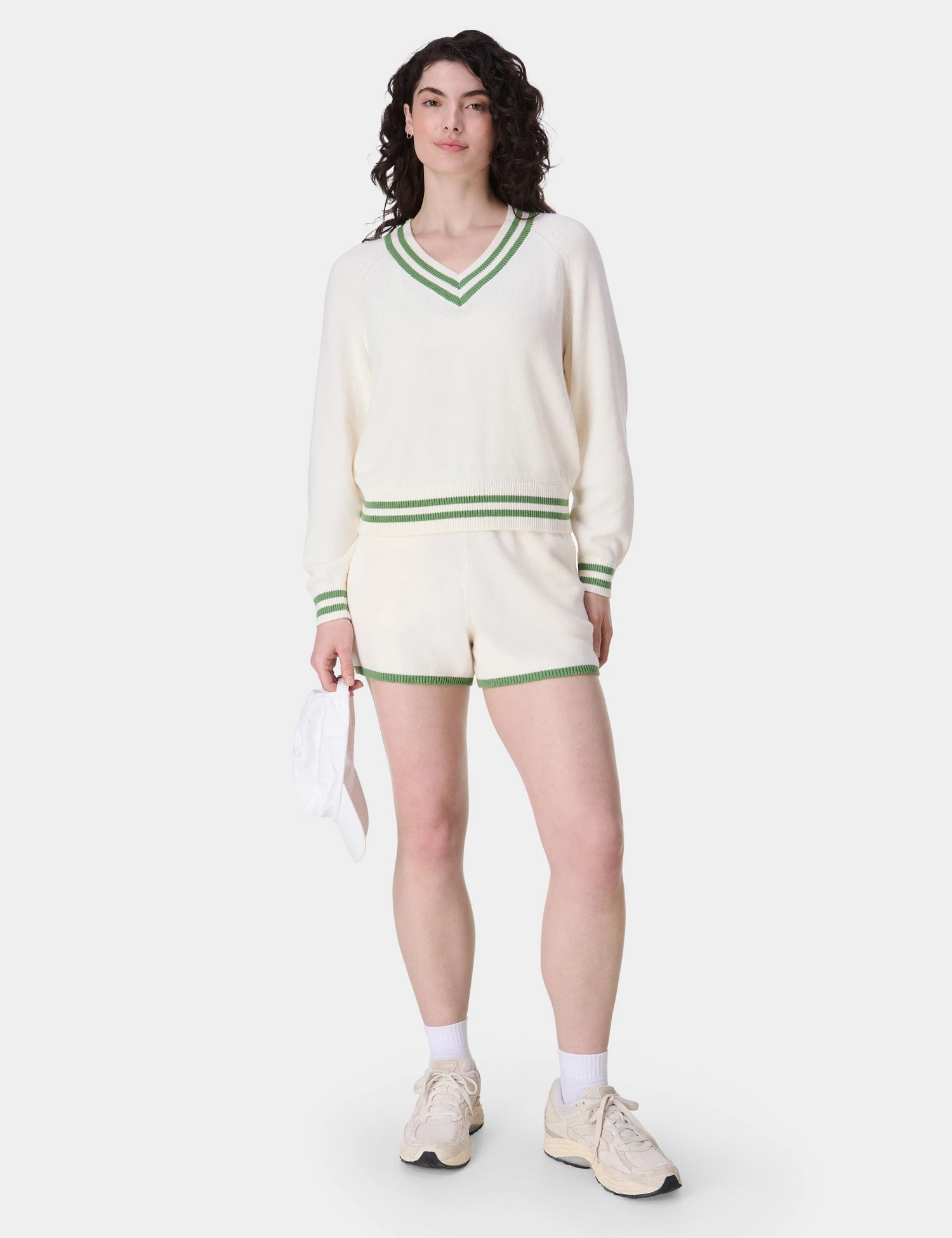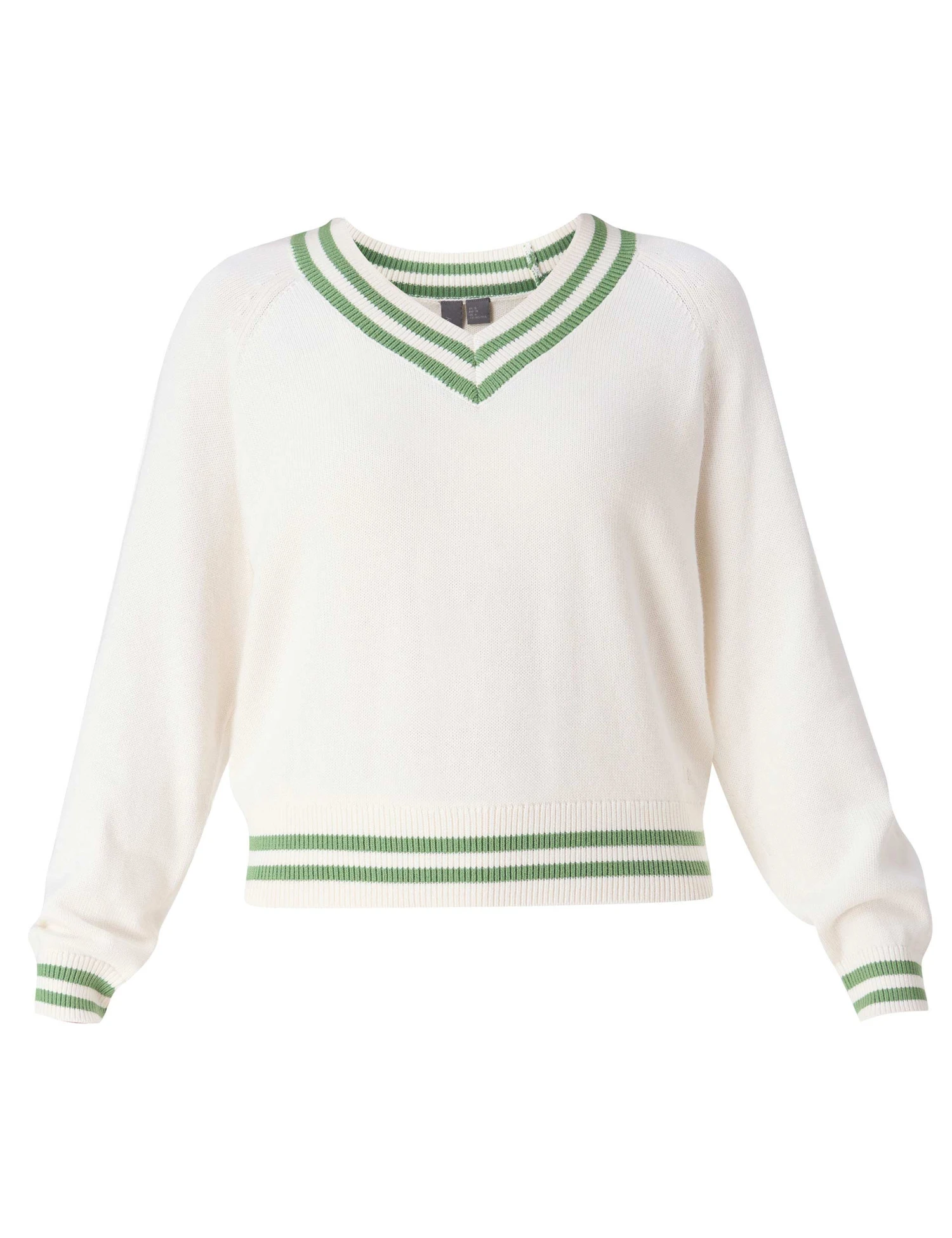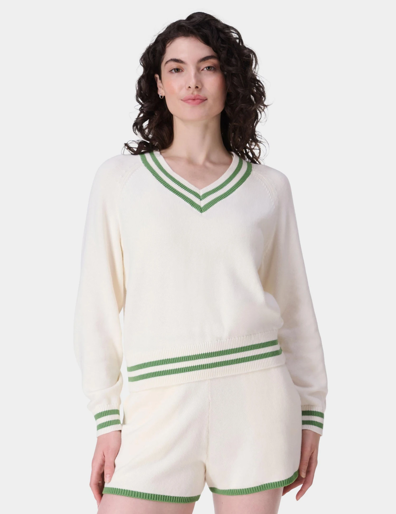 Lounge courtside in the Off Court V-Neck Jumper, where a tennis-inspired knit with a cotton and silk blend adds a soft-touch feel. Its contrast stripe detail on the neckline, hem, and cuffs, plus small embroidery, adds a trendy nod to sporty chic, while the cropped design keeps it perfect for casual hangouts.