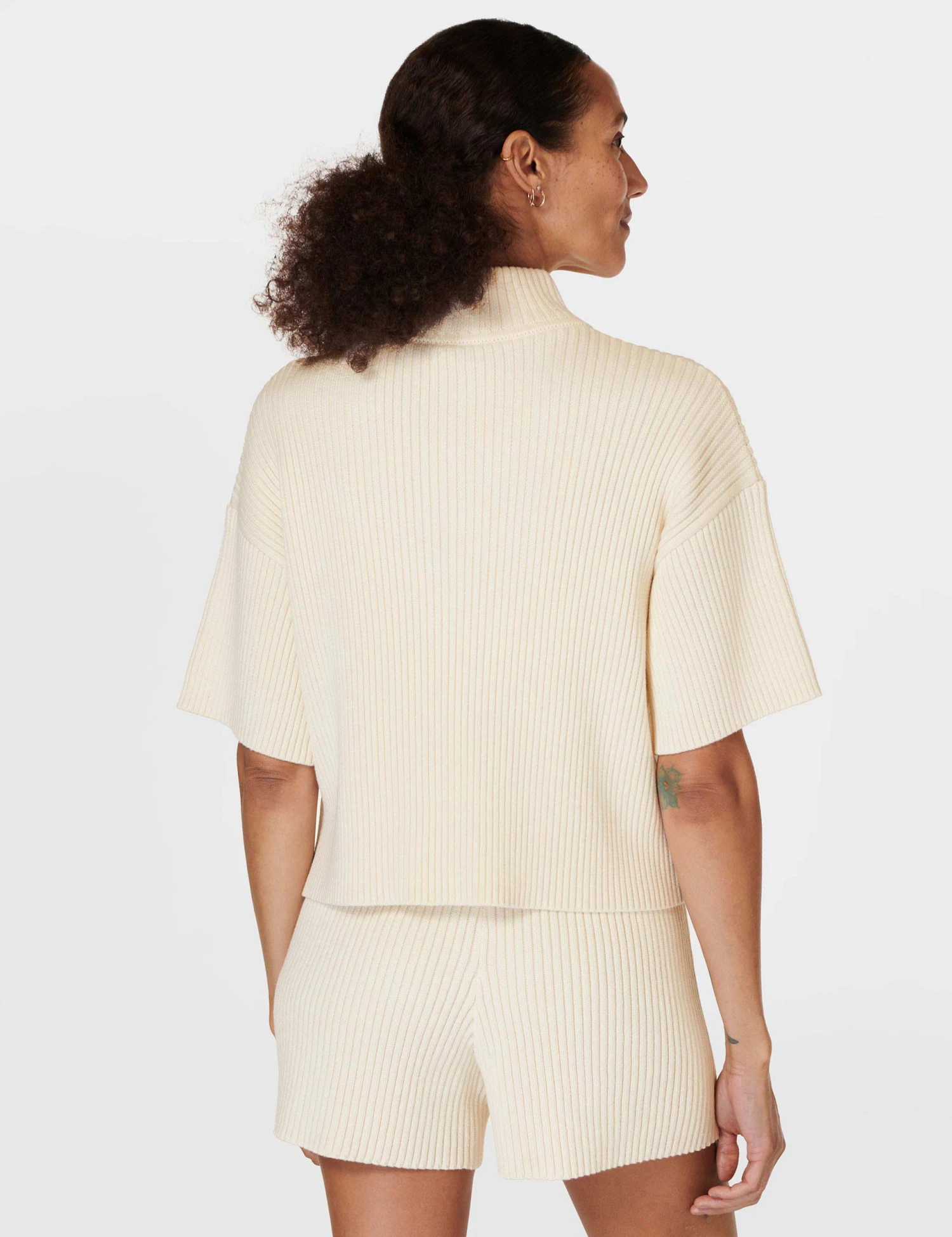 The Retreat Rib Sweater is perfect for elevating your off-duty style, blending soft cotton and wool for ultimate cosiness. Featuring the contemporary charm of a cropped, boxy fit and short sleeves, perfectly accentuated by a versatile half zip that offers the choice of an open look or a snug funnel neck.