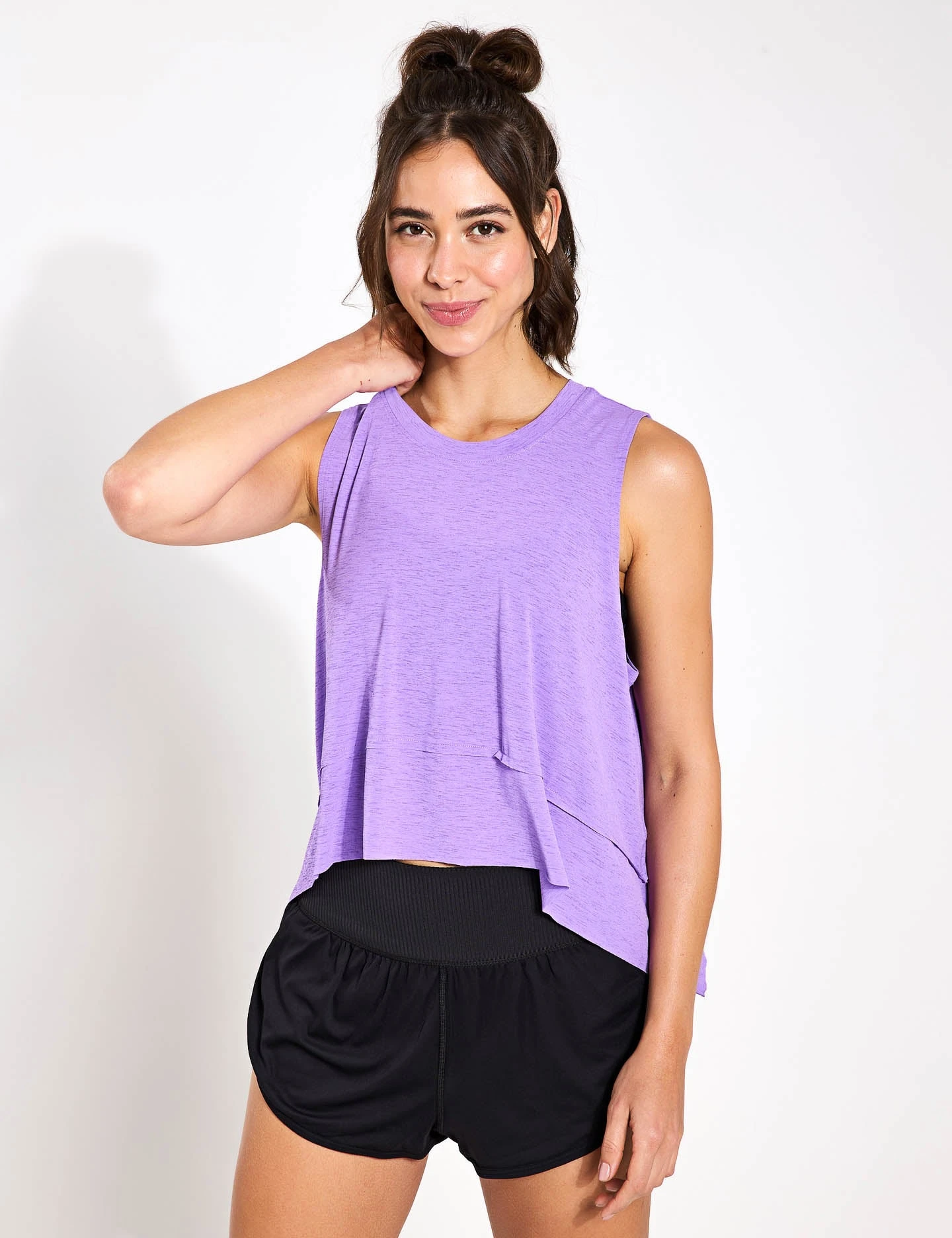 Indulge in effortless comfort with the Tempo Tank, featuring a hip length silhouette and a curved hemline. Designed with a flowy design and raw seam accents, it exudes off duty charm with a polished touch. Elevate your wardrobe staples with this versatile piece, perfect for any activity.