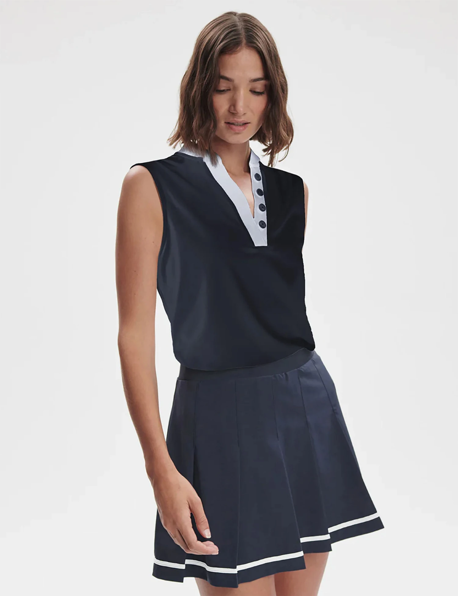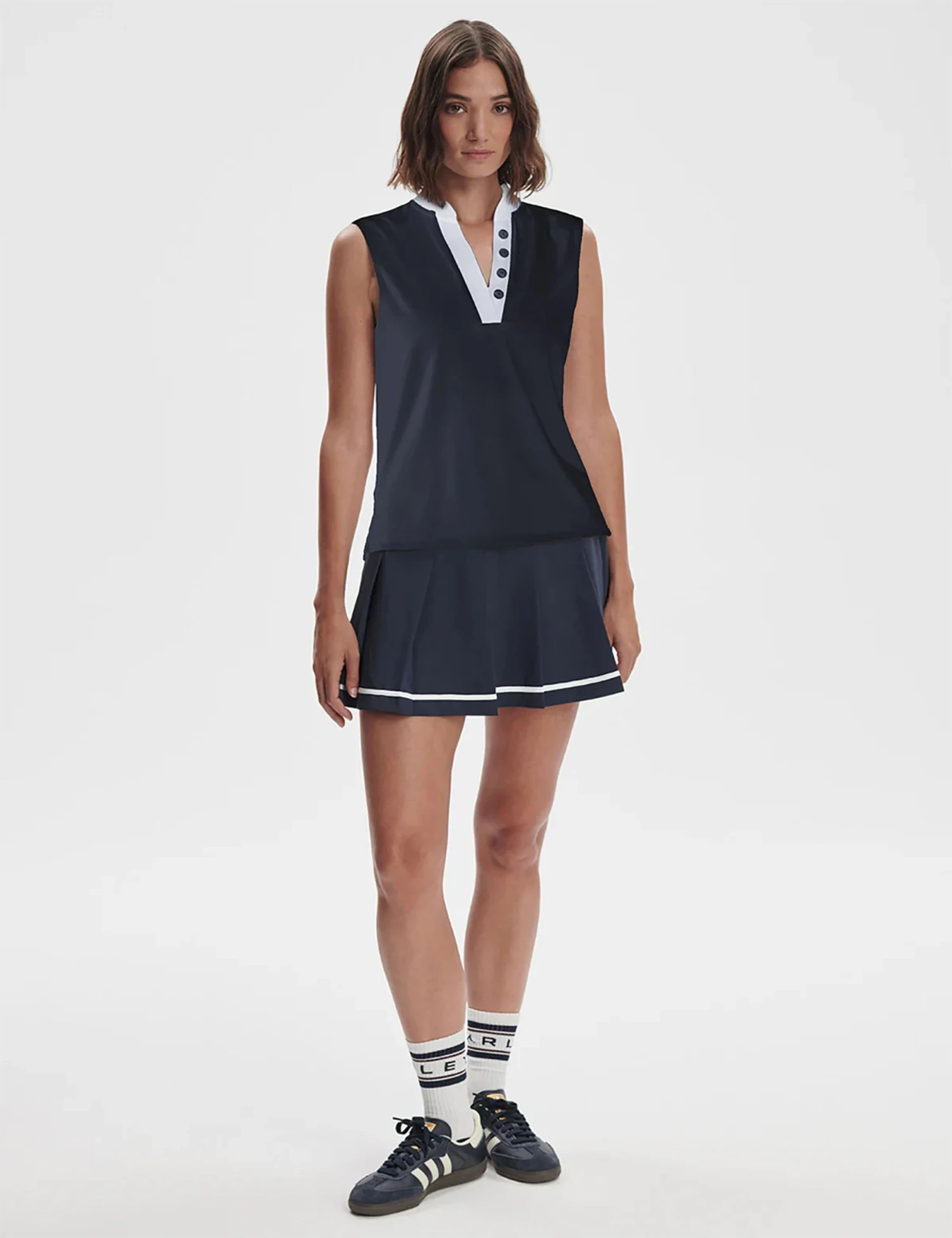 Ace your tennis game in the Shelby Performance Tank, featuring a mock summary placket and side-split hem for a stylish edge on the court. Its moisture-wicking, lightweight fabric with wide armholes keeps you cool, while the V-neck adds a chic touch to every powerful swing.