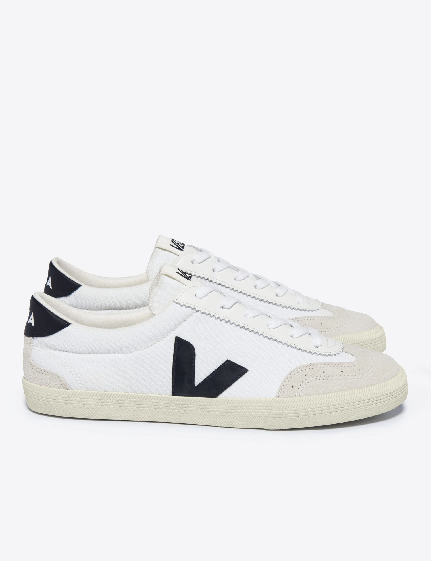 Comfortable and contemporary the Veja Volley Canvas White Black trainers are stylish. Made with a wild rubber sole, canvas upper and plastic lining, these trainers are a modern classic.